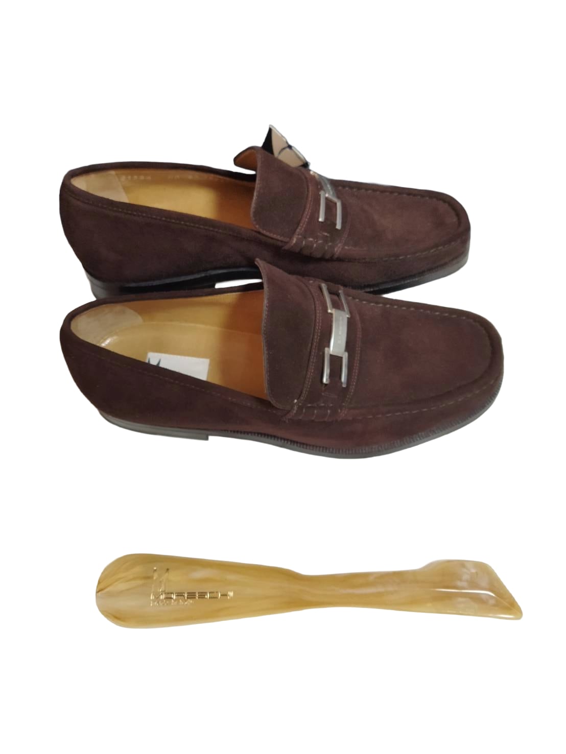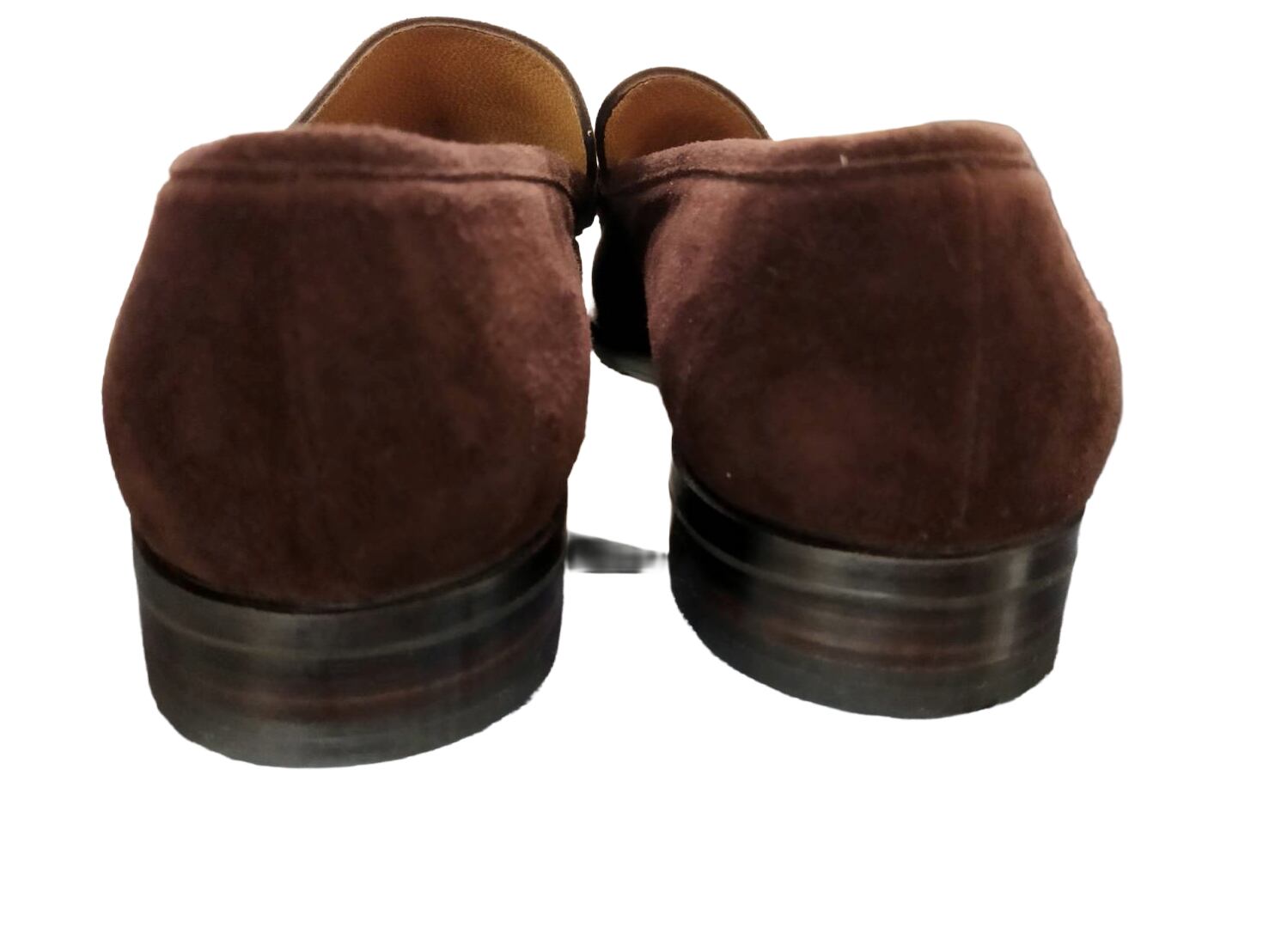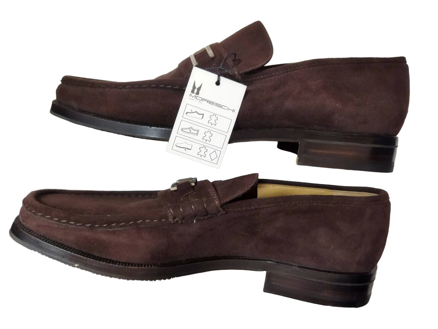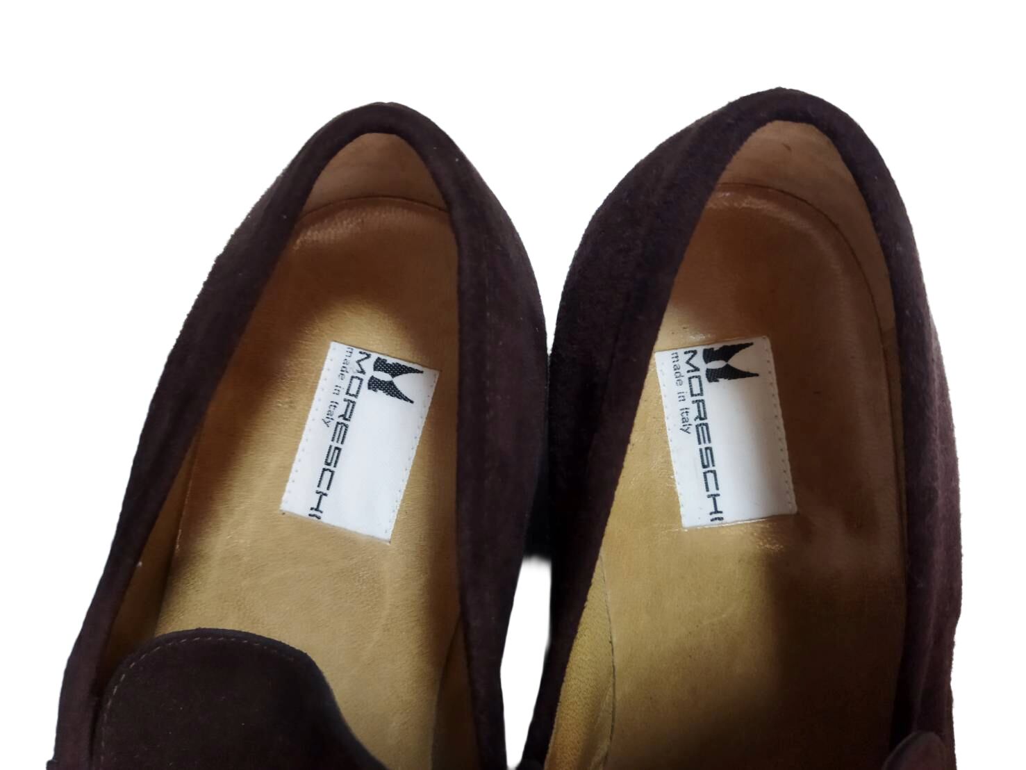 上質なMORESCHI(モレスキー)のブラウン メンズ ビジネスシューズは、スエード素材を使用した洗練されたデザインが魅力です。特にホースビットローファーのスタイルは、上品な印象を与え、ビジネスシーンやフォーマルな場面でも活躍します。